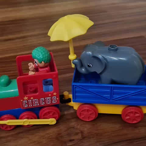LEGO DUPLO sirkusjuna sisältää värikkään junan ja eläinhahmon (norsu) ja keltainen varjo.