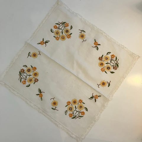 Kaunis luonnonvaalea teollisesti valmistettu reijällinen pöytäliina. Reunuksen kuuluu aaltoina niin kuin kuvassa näkyy. Ehjä, tahraton. Kaipaa tuuletusta pitkän säilytyksen jälkeen.