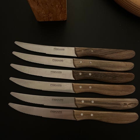 Lienevät uusia tai ainakin liki uusia. Kahvat ovat valkoiset ilman kellastumaa, kuten näissä usein on. Veitsien terissä "R" merkintä. Pakkauksissa on aavistus sanomista (viimeinen kuva)