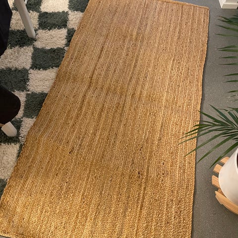 Koivutexin (Rantasalmi?) kaksipuolinen matto. Kunto hyvä, valkealla puolella hieman käytön jälkiä.