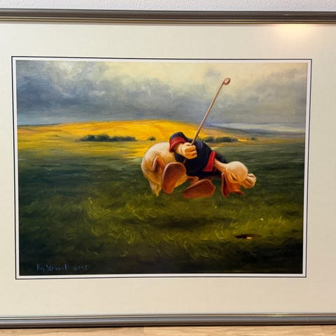 Mitat kuvissa. Golffariteema. Kehyksen oikealla puolen tummia jälkiä. Näkyy kuvissa.