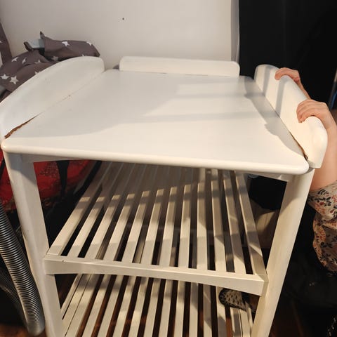 Vauvan hoitopöytä jossa pyörillä liikkuva pesuamme sekä tasot tavaran säilytystä varten.