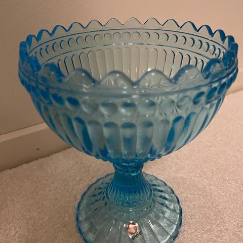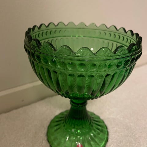 Marimekko koristekulho valmistettu vihreästä lasista. Kulhossa on koristeellinen muotoilu ja jalallinen malli.