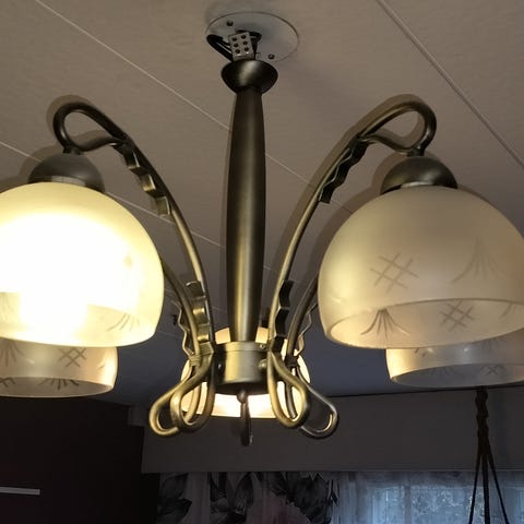 Hyväkuntoinen, ehjä 5-haarainen kattovalaisin, valkoiset lasikuvut.