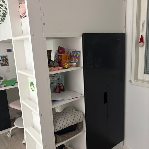Ikea parvisänky 90 x 200 cm. Työpöytä laatikostolla, vaatekaappi yhdellä tangolla ja avohylly. Voi kasata haluamaansa järjestykseen. Ok hyvä käytetty kunto, joitain käytön jälkiä pinnoissa, mutta perussiisti. Meillä ollut verhotanko kiinni sängyn laidassa, sen saa halutessaan mukaan. Tuote on purettu osiin eli helppo kantaa autoon. Kasausohjeet ladattavissa ikean sivuilla. Nouto Etelä-Haagasta.