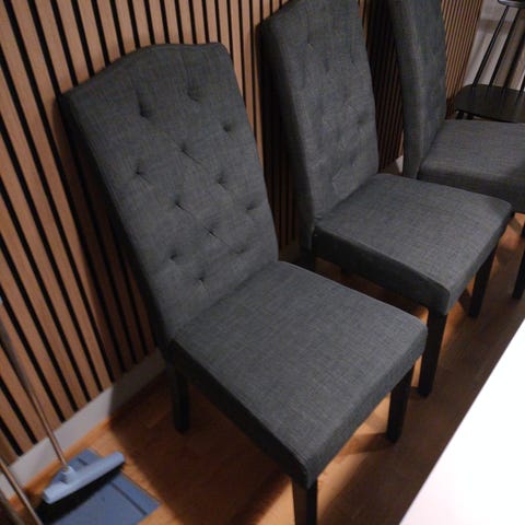 6kpl kangaspäälysteisiä ruokailuryhmän tuoleja. Kangas harmaa ja jalat valkoiset. Kangasosat hyvässä kunnossa. Kahdessa tuolissa pohja ratkennut (kuten kuvassa näkyy) mutta se ei normaalissa käytössä näy.