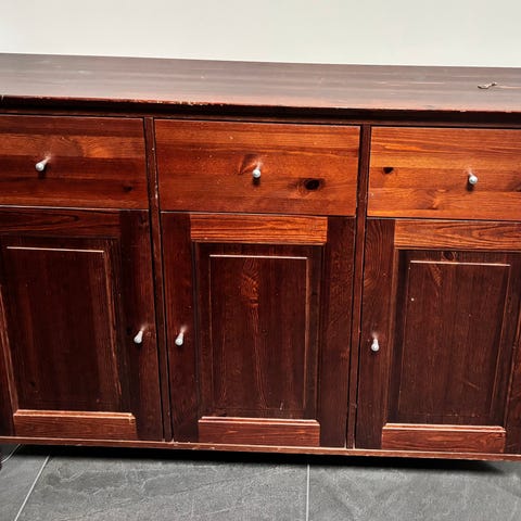 Täyspuinen Askosta aikanaan ostettu lipasto. Petsattu pähkinän sävyiseksi. Nurkissa pientä kulumaa.