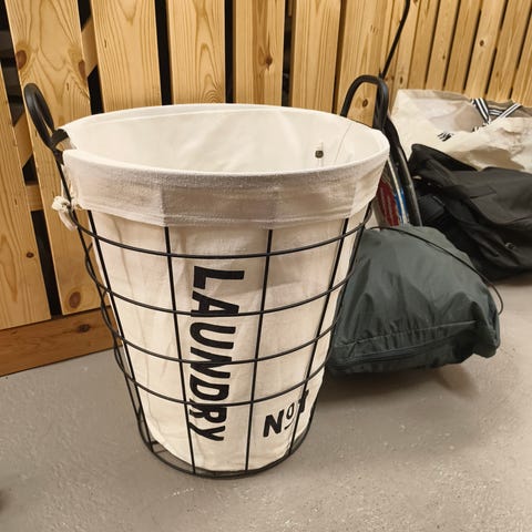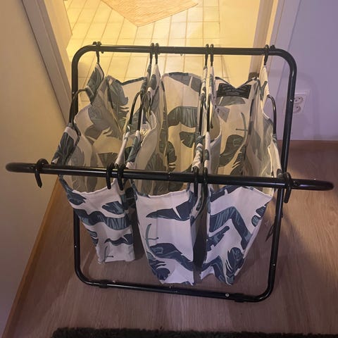 Metallirunkoinen pyykkikori pyörillä, jossa irroitettavat pyykkikassit kahvoilla 4kpl. Mitat: L89-S41-K82cm