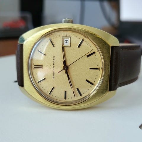 Tätä kello ei paljoa ranteessa ole kulutettu ja siten hyvässä kunnossa, vain vähäisiä käytön jälkiä. Teräskuori kullatulla kehyksellä, päivyri klo 3:ssa ja integroitu Eternan alkuperäinen teräsranneke. Klassinen vintage-kvartsikello sveitsiläiseltä valmistajalta.
