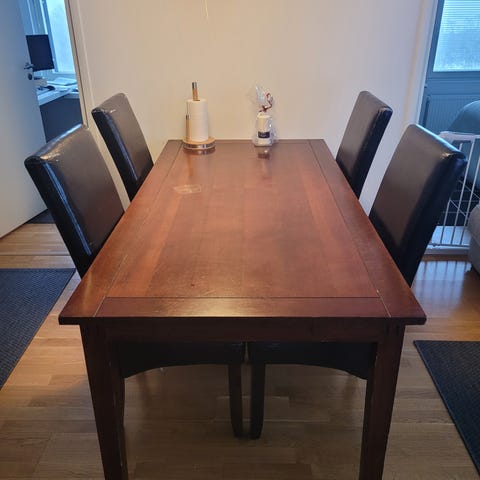 Ilmainen ryokailuryhmä, pöytä ostettu Maskusta, sopii kuudelle henkilölle ja sen saa suurennettua kahdeksalle, mukana 5 tuolia, hyväkuntoinen, nouto Vantaalta Pähkinärinteestä.