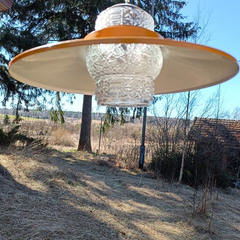 Valkoinen Aris "Pipari"-kattovalaisin, 70-luvulta, suunnittelija Anna-Maija Salo.