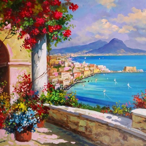 Öljyteos kankaalle 45 × 35 cm, mestari Fabris Gabrielen, kuvaten Välimeren maisemaa talon kukkineen merellä (kukkiva parveke merellä Välimeren maisemassa) upeine kukkineen ja värien upeine sävyineen, kolmiulotteisin siveltimenvedoinkin ja värien kudelmin täydellisesti. Taulu on maalattu myös kehyksen sivuille, haluttaessa ei tarvitse laittaa kehyksen. Takapuolella allekirjoitus ja taiteilijan aitoustodistus. Peräisin yksityiskokoelmasta ja toimitus seurattavissa.