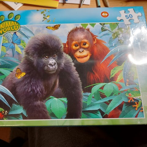 King Palapeli 50 palaa, jossa on kuvituksena kaksi nuorta apinaa ja vehreä tausta. Palapeli sopii lapsille ja sisältää 50 palasta.