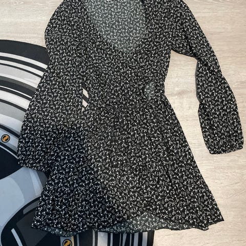 Uudenveroinen mekko viskoosia. Pehmeää ja laskeutuvaa materiaali. Kaunis kukkakuvio, pääntiessä nauhat.