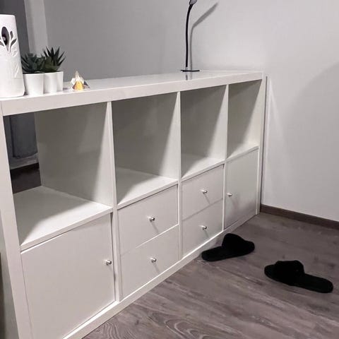 8-osainen hyllykkö, jossa mukana kuvassa näkyvät kolme säilytyslaatikkoa. Kokonaiskorkeus pystyasennossa n. 1,5 m, mahdollista asettaa myös vaakatasoon.