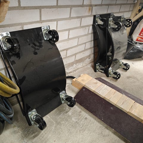 Kantavuus 450 kg/vaunu. Ostettu Motonetistä. Toisen vaunun etureunaan hitsattu kulmaraudasta vahvike, kun keikahti venettä tallissa siirtäessä.