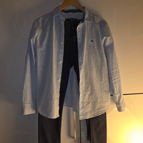 Myydään valkoinen T-paita, tummansininen (valkoisilla pilkuilla) kauluspaita ja tummansiniset housut. Kaikki koossa 152 cm. Ostettu uutena ja käytetty parissa siistimmässä tilaisuudessa.