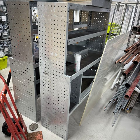 Metallinen varastohylly. Soveltuu erilaisille varastointitarpeille, kuten työkaluille ja tarvikkeille. Kestävä rakenne teolliseen tai kotikäyttöön.