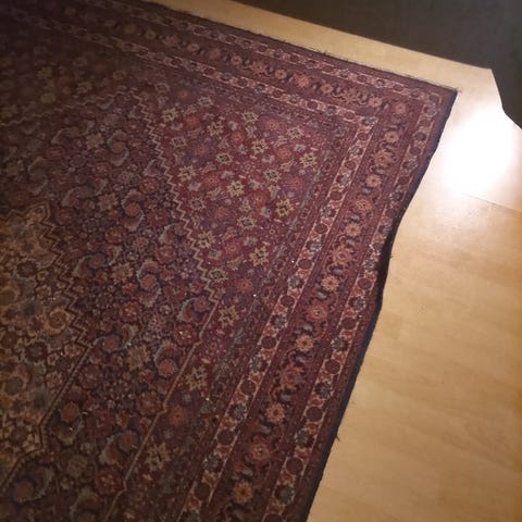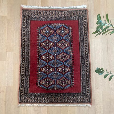 Vanha itämainen villamatto. Väri enemmän marjapuuron punainen/harmaa kuin joulunpunainen. Pituus 113cm ilman hapsuja, hapsujen kanssa 129cm. Leveys 65cm. Ehjä. Iänmukaista kulumaa. Nouto tai postitus.