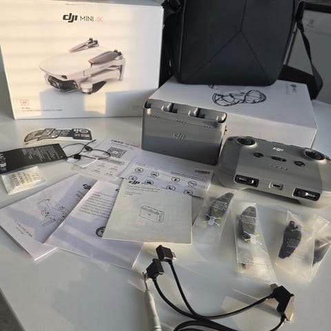 3 kertaa käytetty drone. DJI Mini 4K drone harmaa, varustettu etukameralla ja kauko-ohjaimella. Mukana 3 akkua kantolaukku ja lisävarusteita kuten varapropellit ja latauskaapelit.