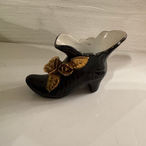 Sisustukseen korkokenkä joka 20cm pitkä. Kaunis posliinirasia halkaisija 8cm