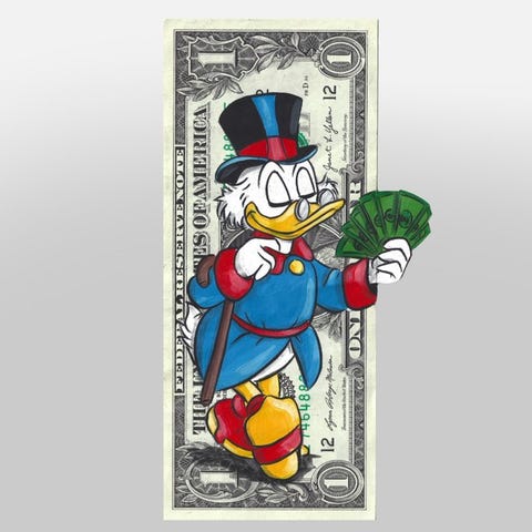 Bart Simpson, kapinallinen ja haastava, etenee yhdysvaltain dollarin setelissä, jossa hänellä on ikoniseksi muodostunut kumi. Teos esitetään akryylituetossa, korostaen sen eksklusiivisuutta keräilyesineenä.