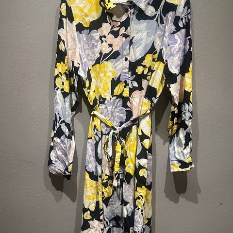 Uusi tumman-/metsänvihreä Vilan mekko koko 40. Etuosa, vyö ja hiat kiiltävää kangasta, takakappale ns.peruskangasta. Vuoreton.