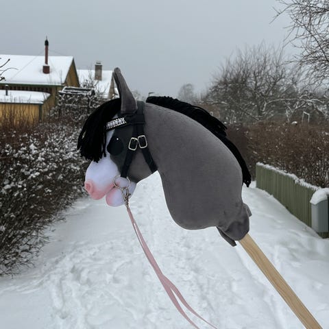 Valmistettu velboakankaasta, harja villalankaa. Korvissa kovikkeet eli pysyvät aidon hevosen korvien muodossa. Kaikki osat hevosessa on ommeltu kiinni eli ei liimattuja osia. Keppi kuuluu hintaan kiinnitettynä, kuvassa irtonaisena.