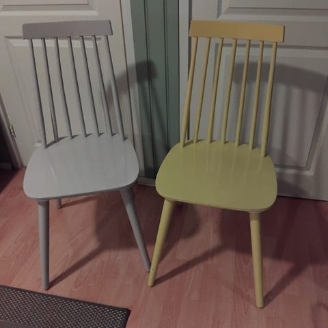 Tukevat valkoiset pinnatuolit 4 kpl. Maalipinnoissa pientä osumaa. 80 e/4 kpl.