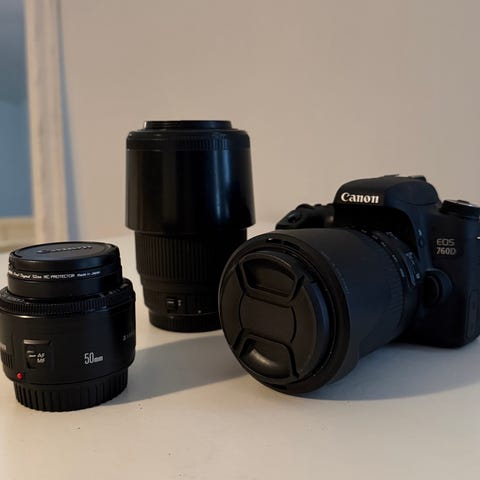 Hyvä kuntoinen Canon EOS 700D järjestelmäkamera. Mukana kolme objektiivia, laturi, akku, ja kantolaukku.