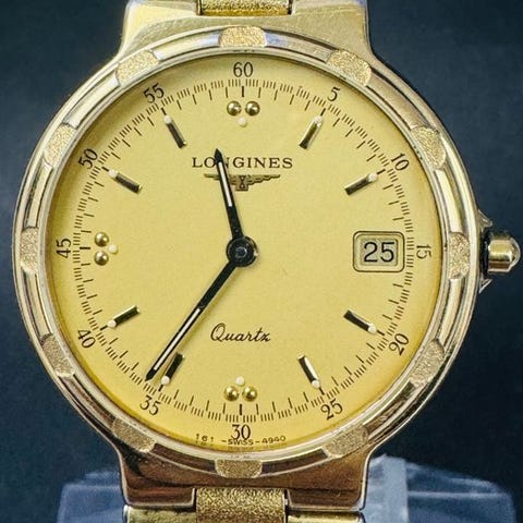 Kultainen kellonäyttö kultaisilla/mustilla merkinnöillä ja osoittimilla.