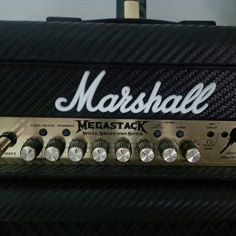 Marshall Megastack sisältäen vahvistimen ja kaiuttimet. Laitteisto on musta ja soveltuu kitaran äänen vahvistamiseen. Sisältää useita säätimiä äänen muokkaamiseen.