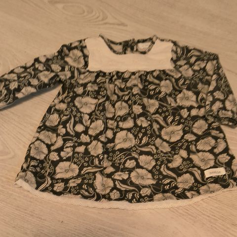 - Kuviollinen kermanvalkoinen/beige Newbie-mekko koko 68 cm, uudenveroisessa kunnossa. Mekon selkäpuolella nepparikiinnitys.