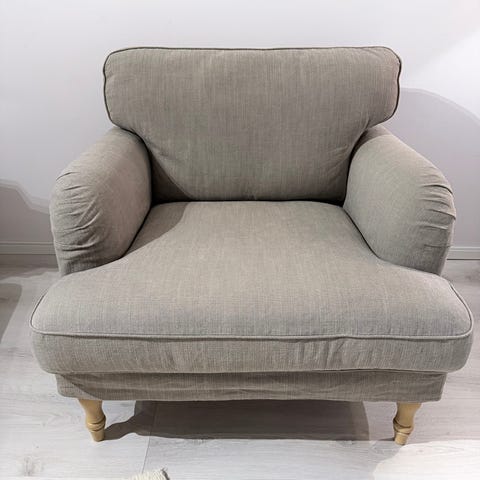 Harmaa-beige värinen Stocksund nojatuoli, jossa vaalean puun väriset jalat. Verhoilu kauttaaltaan irrotettavissa ja pestävä (on pesty). Materiaali 75% puuvillaa ja 25% polyesteria.