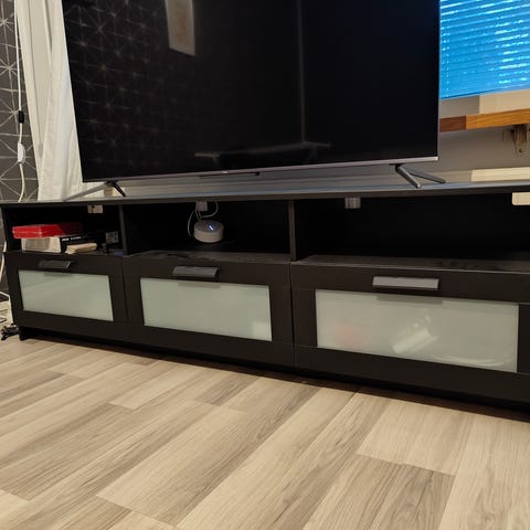 IKEA valkoinen kaappi, jossa kaksi ovea ja sisähylly. Sopii esimerkiksi säilytykseen olohuoneessa tai makuuhuoneessa. Käytetty TV-tasona ja taakse on leikattu aukko johdoille. Korkeakiilto ovet ja metallijalat.
