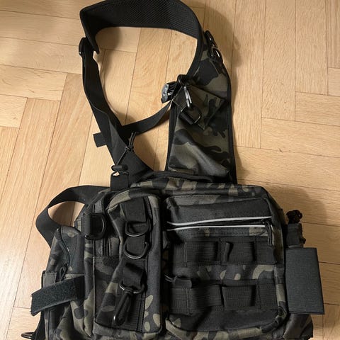 Berkley TMS kalastuslaukku musta. Laukussa on säädettävä olkahihna ja useita taskuja, mukaan lukien läpinäkyvät muovilaatikot säilytystä varten.