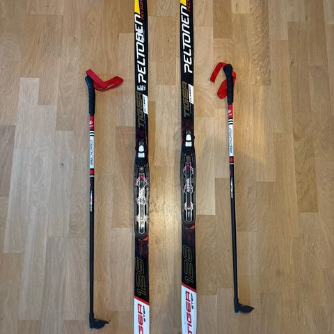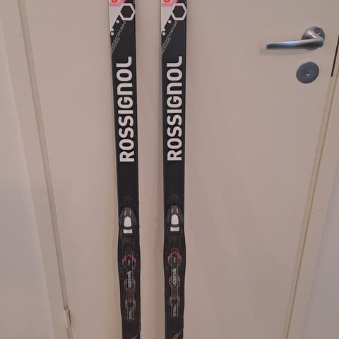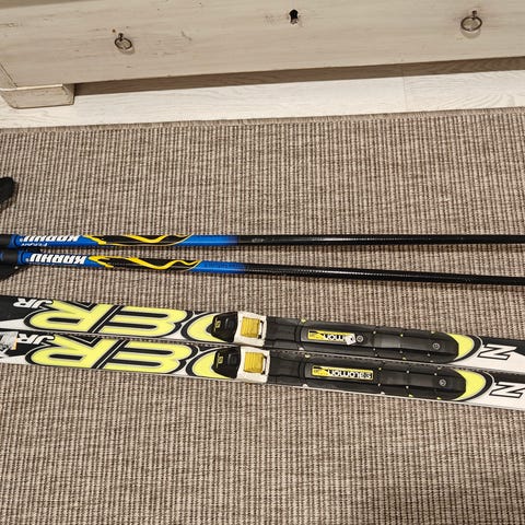 Rossignol Powah voiteluvapaat sukset pitopohjalla 130cm ja Karhu 100cm sauvat. Hyvä pito ja luisto. Nnn-side.