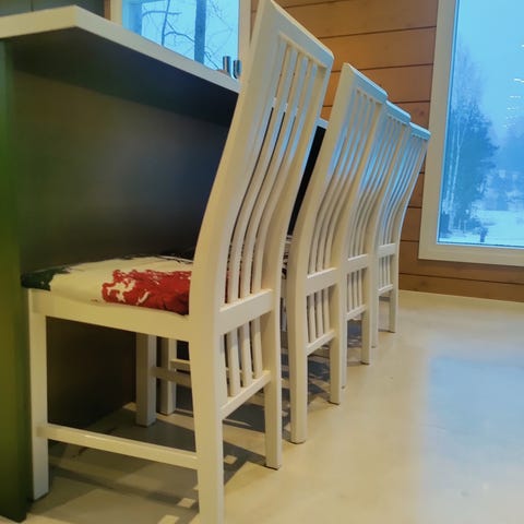 Askosta ostetut, hyvät ja jämäkät ruokapöydän tuolit. Eivät nitise tai natise, vaan ovat edelleen rungoltaan kuin uudet. Puutteita ainoastaan tuolien selkänojien nupeissa, joista käytössä maalipintaa kulunut. Näistä kuvat.