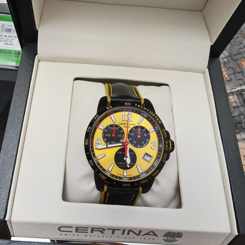 Certina - DS Podium GMT Precidrive Chronograph - C001.639.97.057.03Kast: Alumiini PVD MustaKello: Swiss made quartzWijzerplaat: mustaHalkaisija: 42 mm (ilman kruunua)Lasi: SafiirilasiBand: alkuperäinen musta kumiranneke.Ranteen koko: noin 21 cmKunto: Uusi!Takuu: 1 vuosi 'de Horlogemeesters'Toimitus: saapuu alkuperäisessä laatikossa.Toimitus: Tämä kello lähetetään kirjattuna kirjeenä (DHL Express).