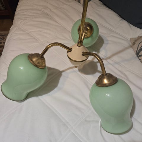 Kattovalaisin opaalilasi kuvulla. Kuvun korkeus noin 11 cm ja leveys 26 cm Kiinnitys mekanismin päistä on leikattu palat pois