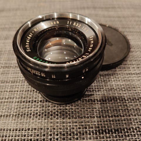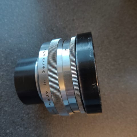 Kuvan mukainen objektiivi. En tiedä tarkkaan mikä objektiivi on kyseessä, mutta ilmeisesti se on peräisin vanhanaikaisesta kopiokoneesta. Objektiivi on todella tarkka kun tarkennetaan lähelle (ks. yksi esimerkkikuva), mutta kauemmas ja äärettömään tarkennettaessa objektiivi ei ole kovin tarkka, jopa pehmeä. Aukon säätö välillä f4.5 - f8, ei suljinta. Polttoväli 8,25 tuumaa, eli noin 210mm. Itse olen kuvaillut tällä omatekoisella kameralla valokuvapaperille. Piirtoympyrästä ei ole tarkkaa tietoa, mutta täyttää mukavasti ainakin 18x24 (cm) valokuvapaperin (ks. esimerkkikuva). Linssi naarmuton ja siisti, ei fungusta, pientä pölyä vain.