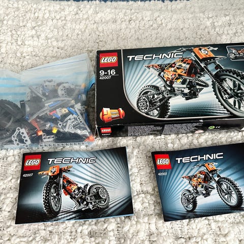 Lego Technic 42063 moottoripyörä. Koottu pari ensimmäistä komponenttia, joten alkuperäiset pussit revitty auki ja nyt pussitettu uudestaan. Kaikki palat ja ohjekirja tallella.