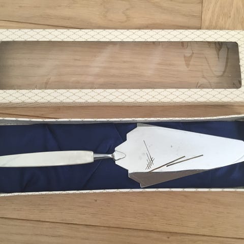 Musla kakkulapio. Hopeaa ja terästä. Käyttämätön. Ei kaiverruksia. Nouto kurttila