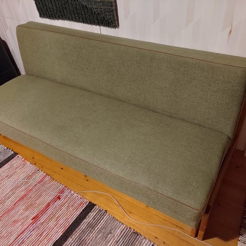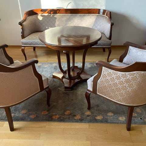 Sohvaryhmä suoraan menneisyydestä. Rungot ja istuinosat ehjät, nurkissa kissojen kynsien jälkiä. Tuoleja kaksi kappaletta. Säilytetty kuivissa sisätiloissa.