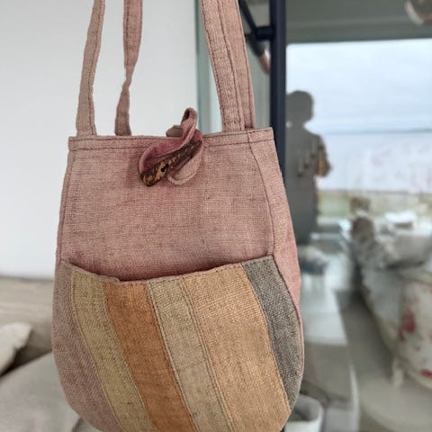 Myydään vahvasta sisustuskankaasta tehty pussukkalaukku jossa erillinen vuori ja välissä silitetty vanu, säädettävä paksu hihna (samasta kankaasta tehty kuin laukku) maksimipituus 135 cm. Sangan leveys 21 cm. Laukun korkeus 21 cm.