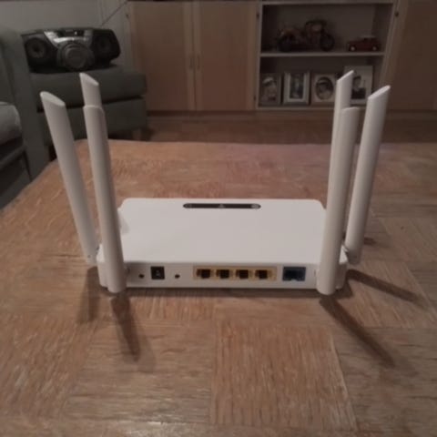 Musta reititin verkkolaite, jossa on merkkivalot Power, US/DS, Online, 2.4 GHz, 5 GHz ja useita portteja. Laite soveltuu langattomaan verkkoyhteyteen kotikäyttöön tai toimistoon.
