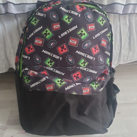 Vain vähän aikaa ehti olla lapsella käytössä. Kiva Minecraft tyylinen reppu. Selkärepussa on yksi iso, vetoketjulla suljettava lokero, vetoketjullinen etutasku ja sivuilla 2 verkkotaskua. Pienillä ”lego”paloilla voi tehdä haluamansa kuvion eteen.