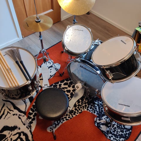 Trak System rumpusetti mustassa värissä. Settiin kuuluu rummut ja symbaalit. Rumpujen pinnat ovat käytön jäljiltä kuluneet. Sopii erilaisiin musiikkityyleihin ja harjoitteluun. Todella tanakat rummut.