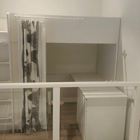 Myydään hyvässä käytetyssä kunnossa oleva Ikean lasten tai nuorten kerrossänky työpöytätasolla ja hyllyillä. Sänky on ehjä ja tukeva. Pöytälevyssä muutamia naarmuja tullut,ennen kuin tajusin ostaa hiirimaton suojaksi. Mustavalkoinen. Kuvassa näkyvä irrallinen laatikosto tai patja eivät kuulu kauppaan.