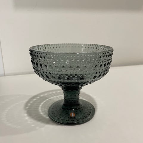 Iittala Kastehelmi kulho sinisessä värissä. Lasimateriaali ja koristeellinen helmiäinen pintakuviointi. Sopii esimerkiksi tarjoiluun tai sisustuselementiksi keittiössä tai ruokailutilassa. Iittala merkki puuttuu, ajan saatossa huuhtoutunut pois. Kulhoista 1 kpl 23cl väri sininen myydään.